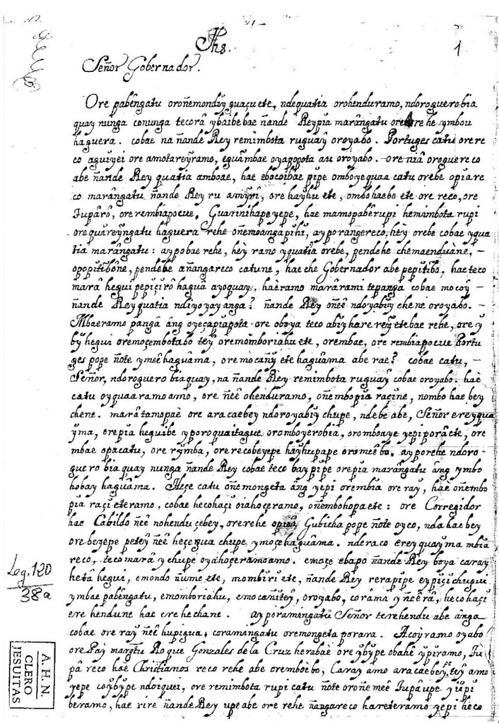 Imagen 1. Carta en guaraní de Nicolás Ñeenguirú, cacique guaraní, al rey con posterioridad a la firma del Tratado de Madrid (1753) [9].